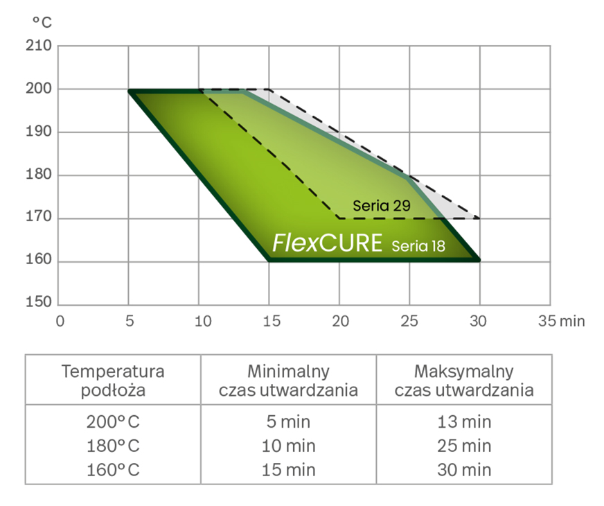 Rdzeniem serii 18 jest rozszerzone okno utwardzania od 160°C do 200°C. Ten niezwykły zakres wygrzewania pozwala na stabilne, wydajne przetwarzanie – nawet w przypadku elementów o różnej grubości. Nakładające się warunki utwardzania odpowiadające również serii 29 eliminują potrzebę czasochłonnych regulacji pieca, oszczędzając czas, energię i znacznie zwiększając niezawodność procesu.