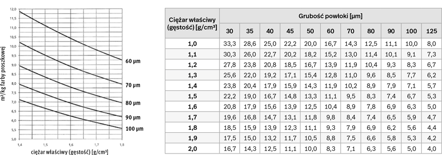 Zależność wydajności farby w [m2/kg] w odniesieniu do grubości powłoki [μm] i ciężaru właściwego (gęstości) farby [g/cm3]
