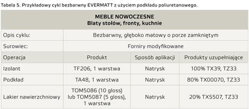 Opcją wartą polecenia, zwłaszcza producentom wielkoseryjnych mebli białych w wysokim połysku, jest bezstyrenowy lakier poliestrowy PRG5A010 o wydłużonym do ośmiu godzin czasie żywotności mieszanki. Produkt wymaga wprawdzie efektywnego systemu suszenia, ale gwarantuje bardzo wysoki poziom bieli, odporność na siadanie powłoki i trwałość połysku (tabela 6).