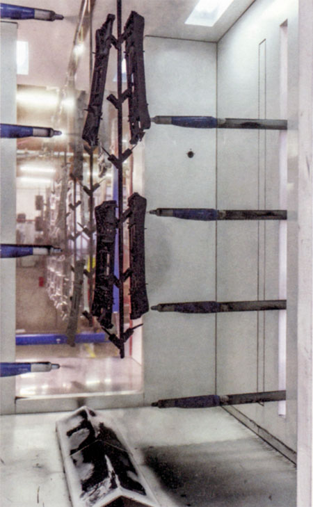 Kabina automatyczna w przedsiębiorstwie Haworth wyposażona jest w cztery pistolety automatyczne po każdej stronie oraz stanowisko do wstępnego i wykończeniowego malowania elementów o skomplikowanych kształtach. Każdy pistolet umożliwia wyrzut farby proszkowej do 400 g/min i dzięki temu zapewnia optymalną skuteczność nanoszenia farby. Odessanie mgły lakierniczej odbywa się poprzez kanał odpływowy znajdujący się w centralnej części kabiny. Kabina automatycznego malowania jest zintegrowana z separatorem farby "twin cyclone", który umożliwia odzysk farby na poziomie ok. 98%.