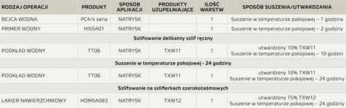 Tabela 2. Przykładowy cykl lakierowania blatów stołów z drewna otwarto porowego z użyciem wysoko odpornego lakieru nawierzchniowego.