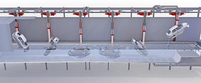 Do transportu karoserii przez strefę obróbki wstępnej oraz malowania zanurzeniowego (KTL) po raz pierwszy zastosowano w Chattanooga innowacyjny system transportowy E-Shuttle. W tym nowoczesnym przenośniku, opierającym się na sprawdzonych elementach budowy, każdy z wahadłowych mechanizmów jezdnych Shuttle wyposażony jest w trzy oddzielne swobodnie programowalne osie (oś jezdna, oś podnoszenia i oś obrotowa) oraz własne sterowanie. Ponieważ przebieg ruchu każdej osi można bardzo łatwo i szybko zaprogramować, daje to możliwość sprawnego indywidualnego ustalenia kąta zanurzenia i czasu procesu oraz jego nadzoru dla każdego typu karoserii, np. limuzyny, coupé albo wariantu z szyberdachem. Kombinacja ruchów podnoszenia i obracania do 360 stopni umożliwia realizowanie wszelkich pozycji włącznie z całkowitym ułożeniem w pionie. Dzięki ciągłemu rejestrowaniu danych o pozycji poszczególnych mechanizmów jezdnych Shuttle oraz centralnej jednostce sterującej, która koordynuje przemieszczanie się, nie dochodzi do kolizji.