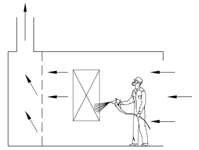 Kabina malarska zamknięta ze wszystkich stron podczas natryskiwania, z wyjątkiem otworów w bocznych ścianach do wprowadzania i usuwania części roboczych i przewodów do wentylacji wyciągowej; otwarta przednia strona kabiny używana jest jako wlot nawiewanego powietrza i jako dostęp dla operatora.