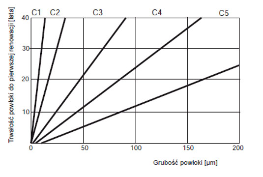 Rys. 3. Przewidywana trwałość powłoki cynkowej w zależności od warunków środowiska korozyjnego i grubości [na podstawie 4]