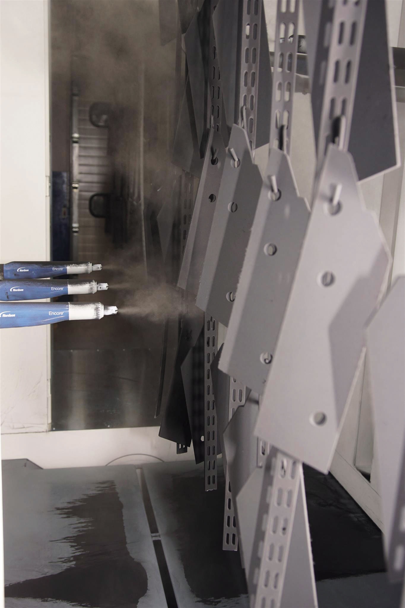 Na każdym manipulatorze zainstalowano po trzy pistolety automatyczne Encore. Są to lekkie, kompaktowe pistolety zapewniające 100 kV ładowania cząsteczek proszku. Oferują najwyższą wydajność powlekania dostępną dla systemów opartych na zwężkach Venturiego. Są jednym z najlżejszych i najmniejszych narzędzi do malowania proszkowego. Dzięki nim pracownicy mogą uzyskać doskonałe krycie i najwyższą wydajność malowania. Pistolet Encore ma konstrukcję zapewniającą szybkie, łatwe czyszczenie strumieniem powietrza bez demontowania go, co jest nieodzowne w celu zapewnienia szybkiej zmiany koloru nanoszonego proszku. Dodatkowo do dyspozycji operatora są dwa pistolety do ręcznego malowania detali. Są one ergonomicznie zaprojektowane, tak aby idealnie pasowały do ręki. Dzięki niewielkiej wadze i dobremu wyważeniu ułatwiają pracę operatorowi oraz zapewniają równomierne i powtarzalne nakładanie powłok.