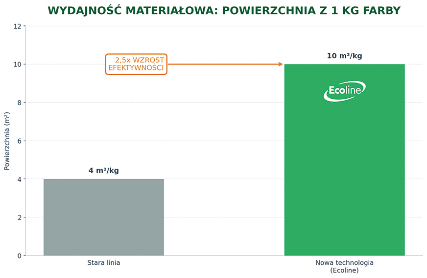 Zastosowana strategia Zero Waste w projekcie Ecoline znajduje bezpośrednie odzwierciedlenie w twardych danych. Stara lakiernia generowała aż 2,65 tony odpadów farby rocznie, co stanowiło znaczne obciążenie dla środowiska. Dzięki precyzyjnemu systemowi cyklonowemu i zamkniętemu obiegowi proszku nowa instalacja zredukowała tę ilość do zaledwie 0,5 tony. Oznacza to spadek masy odpadów o ponad 80% (2,15 tony rocznie). Dodatkowo całkowita eliminacja gazu ziemnego na rzecz zasilania elektrycznego pozwoliła uniknąć spalania 123 tys. metrów sześciennych paliwa, co zapobiega emisji blisko 294 ton CO₂ rocznie.