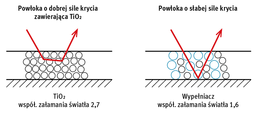 Na rysunku 1 przedstawiono wpływ obecności oraz braku TiO₂ w powłoce na proces rozpraszania światła widzialnego. Im więcej światła przechodzi przez warstwę powłoki i ulega odbiciu od podłoża, tym mniejsza jest siła krycia. Natomiast im większa ilość światła ulega rozproszeniu i odbiciu w obrębie powłoki, nie docierając do podłoża, tym większa jest siła krycia.