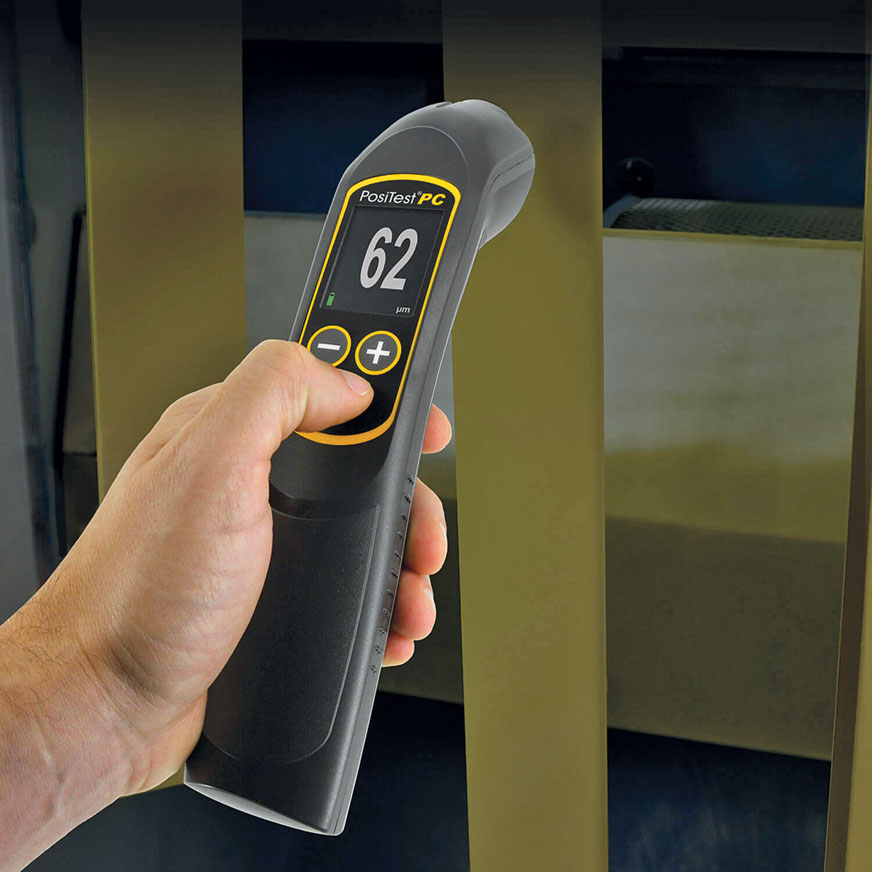 Bezkontaktowy miernik grubości powłok proszkowych przed wypaleniem PosiTector Powder Checker, wykorzystujący technologię ultradźwiękową do przewidywania grubości powłoki po wypaleniu. Powder Checker pozwala zoptymalizować zużycie lakieru, unikając jego nadmiernego lub niedostatecznego zużycia