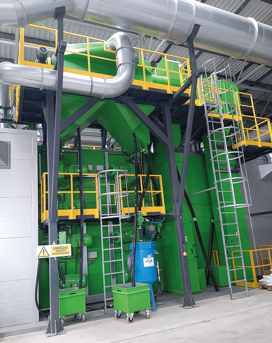 Proces produkcyjny rozpoczyna się w wielkogabarytowej śrutownicy wirnikowej komorowej model OWK-5,0×5,0×40 (fot. 2, 3), która została zaprojektowana oraz wykonana dla firmy IRYD/KENSUS w Gołdapi. Śrutownica posiada następujące parametry techniczne: