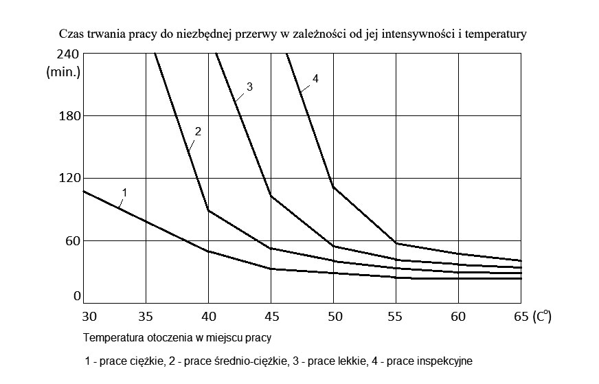 Rys. 1. Maksymalny czas pracy do minimum 20-minutowego odpoczynku w zależności od temperatury i rodzaju pracy