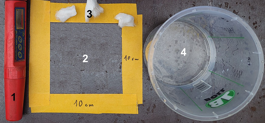 Fot. 5. Przykładowy zestaw do pomiaru zasolenia metodą tamponową: 1 – konduktometr; 2 – sposób wyznaczenia powierzchni pomiarowej; 3 – tampony; 4 –naczynie z wodą destylowaną, objętość wody np. 100 ml