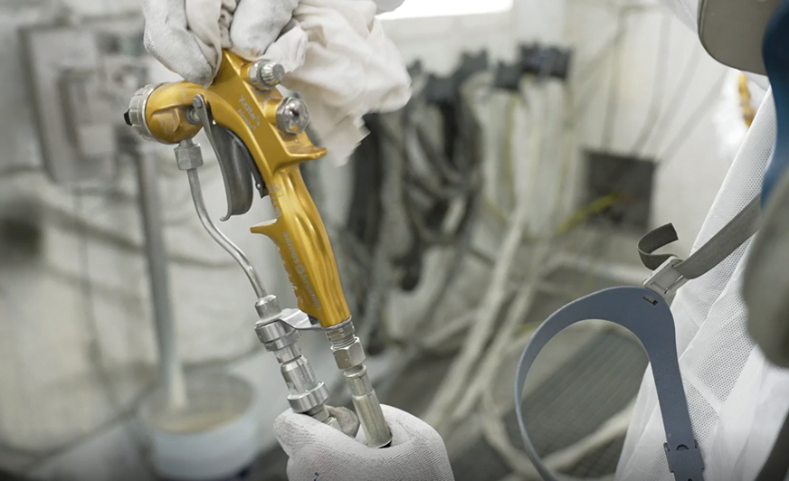 Aplikacja podkładu została oparta na technologii Airmix® z wykorzystaniem pistoletów Xcite®+. Ten etap procesu zaprojektowano z myślą o wydajności, odporności powłoki oraz jej powtarzalności. Podkład zasilany jest przez pompy lakiernicze 40C100 oraz 34F60 Flowmax®, które zapewniają stabilne podawanie materiału i ciągłość pracy przy zmiennym obciążeniu produkcyjnym. Dzięki temu możliwe było utrzymanie stałych parametrów aplikacji bez konieczności częstych regulacji czy przestojów.