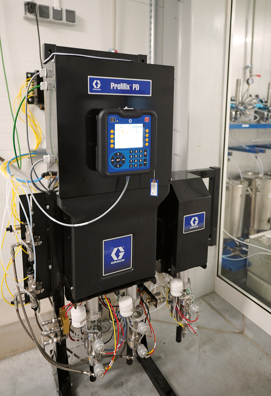 Wybór urządzeń dozujących Graco nie był przypadkiem. Poprzedził go proces wieloetapowych testów laboratoryjnych i przemysłowych, w których kluczowe znaczenie miały precyzja dozowania, odporność materiałowa oraz kompatybilność z chemikaliami lakierów UV, bo takie przewidziano do stosowania w projekcie nowo powstającej, w pełni zautomatyzowanej i zrobotyzowanej lakierni firmy OptimumPoints.