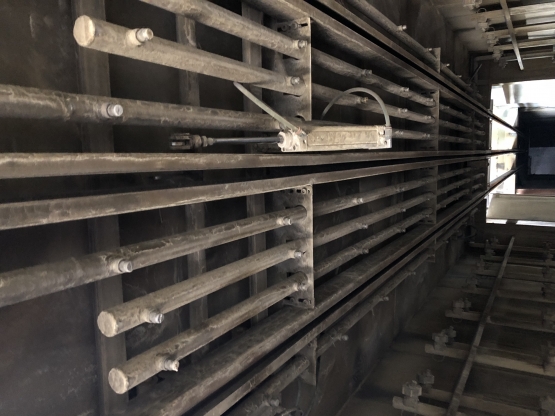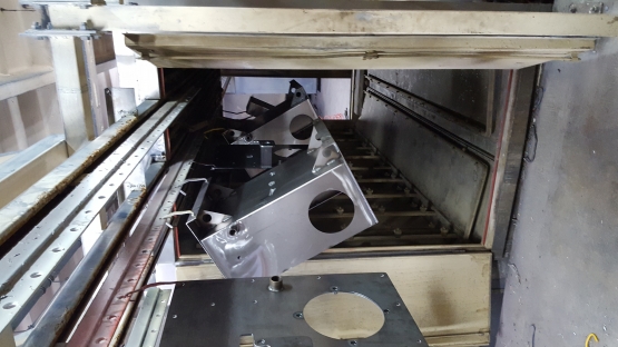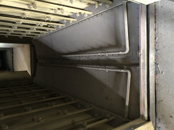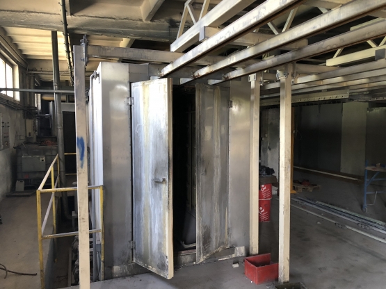Myjka natryskowa komorowa - przelotowa do przygotowywania powierzchni (obróbka chemiczna, płukanie, płukanie demi ), max chwilowe zapotrzebowanie energii elektrycznej - 7kW. Wymiary robocze: długość 4m, szerokość 1,5m, wysokość 1,9m. Komora natryskowa izolowana z wszystkich stron izolacją nienasiąkliwą o przekroju 50mm. Zbiornik płynów operacyjnych zamontowany pod komorą natryskową, przedzielony przegrodami, pojemność komory środków chemicznych ok. 3m3, komory wody ok. 2m3, komory płukania demi ok. 1m3. W zbiornikach zamontowane wodne wymienniki cieplne podgrzewające roztwór chemiczny do temperatury pracy. Wymiennik zasilany palnikiem olejowym o mocy ok.27kW. zainstalowanym na boku urządzenia. Zespół tłoczny (pompy) zamontowane z boku komory roboczej. Połączone z zbiornikami systemem rur kwasoodpornych. Przełączanie poszczególnych stanów pracy urządzenia następuje poprzez załączenie odpowiednich pomp zasilających trzy niezależne zespoły dysz i przełączenie zaworu powrotnego w wnętrzu urządzenia powodujące grawitacyjny powrót płynu obróbczego do właściwej komory. Dysze kuliste z możliwością regulacji kierunku spryskiwania zamontowane na ścianach bocznych i podłodze w ilości ok.170 szt.- mycie , 140szt. – płukanie, 60szt.- płukanie demi. Dając odpowiednio ok. 1200, 800, 200 ltr. przepływu na minutę. Dysze natryskujące wodą demineralizowaną zainstalowane tylko na suficie komory natryskowej powodują spłukanie i pasywację elementów. Zamontowany system filtracyjny płynów z łatwo regenerowalnym wkładem z włókien syntetycznych zasilany z oddzielnych pomp obiegowych powoduje zatrzymanie zanieczyszczeń w postaci tłuszczów i innych. Dodatkowym systemem czyszczenia środka jest zespół odstojników separujących zanieczyszczenia i filtrów przepływowych w poszczególnych gałęziach zasilających. Układ transportu wewnątrz urządzenia wykonany z stali kwasoodpornej wyposażony w napęd pneumatyczny powodujący ruch posuwisto-zwrotny mytych elementów w czasie natrysku (zwiększający jakość mycia elementów) Urządzenie wykonane w całości z stali kwasoodpornej gat. 1.4301 oprócz osłon zewnętrznych wykonanych z blachy stalowej malowanej proszkowo. Specyfikacja: 1. Komora urządzenia zbudowana z stali kwasoodpornej. Konstrukcje tworzą blachy zaginane tworzące panele łączone poprzez spawanie, wzmacniane kształtownikami, wypełnione izolacją, poszycie zewnętrzne to blachy stalowe malowane proszkowo montowane poprzez nitowanie. Grubość blach elementów nośnych 2mm, poszycia paneli 1,5mm. Poszycia wykonane w całości z stali kwasoodpornej gat. 1.4301 2. Zbiorniki płynów operacyjnych zainstalowane pod komorą roboczą. Tworzą ją ściany zbiornika w postaci blach zaginanych łączonych spawaniem, wzmacnianych systemem wzmocnień wypełnionych izolacją. Poszycie stanowi blacha stalowa malowana proszkowo. Blachy ścian zbiornika blacha kwasoodporna gat. 1.4301 grubości 2mm W zbiornikach zainstalowane wymienniki rurowe podgrzewające płyny do temperatury pracy, system rur łączących, system zaworów i przegród separacyjnych. Zespół zbiorników połączony z komorą roboczą poprzez spawanie. 3. Sterowanie elektryczne: Praca myjki automatyczna. Cykl pracy myjki 3-krokowy, po załączeniu urządzenie realizuje zadane cykle w odpowiedniej kolejności i w czasie zaprogramowanym w sterowniku cyfrowym. Sterownik marki Siemens wyposażony w wyświetlacz ciekłokrystaliczny umożliwiający podgląd stanu pracy, zaprogramowania oddzielnych czasów dla poszczególnego kroku i temperatury kąpieli. Szafa sterownicza o wymiarach 770x770mm wykonana z stali nierdzewnej zainstalowana na ścianie urządzenia. Przykładowy cykl pracy: Krok1 - odtłuszczanie, fosforanowanie + ociek (przeważnie 5 + 1,5min.) Krok2 - płukanie + ociek (ok. 2 + 1,5min.) Krok 3 - płukanie demi + ociek (ok. 2 + 1,5min.) Po zakończonej obróbce (kroku 4) urządzenie zostaje wyłączone. Parametry techniczne podzespołów: - moc i typ pomp tłocznych chemii Ebara 3MHS 50-160/5,5kW - moc i typ pomp filtrów Ebara CDXHS 70/05 0,25kW - moc grzewcza palnika 27kW typ Giersch R-1 - ciśnienie powietrza - 6bar /ok. 100ltr./min - ciśnienie cieczy myjącej 1,5-2,5bar. - osprzęt pneumatyczny ( zawory, siłowniki, inne) Metal Work Cena butto do negocjacji. Sprzedaż na fakturę VAT 23% Do sprzedania również kabina lakiernicza (4,5 m), system transportu podwieszanego (omega): stały z polem odkładczym i ruchomy (1 wózek pojedyńczy z 3 szynami i 2 wózki potrójne 3 x 3 szyny). Do sprzedania również cała lakiernia proszkowa budynek 870 m2 + wyposażenie.